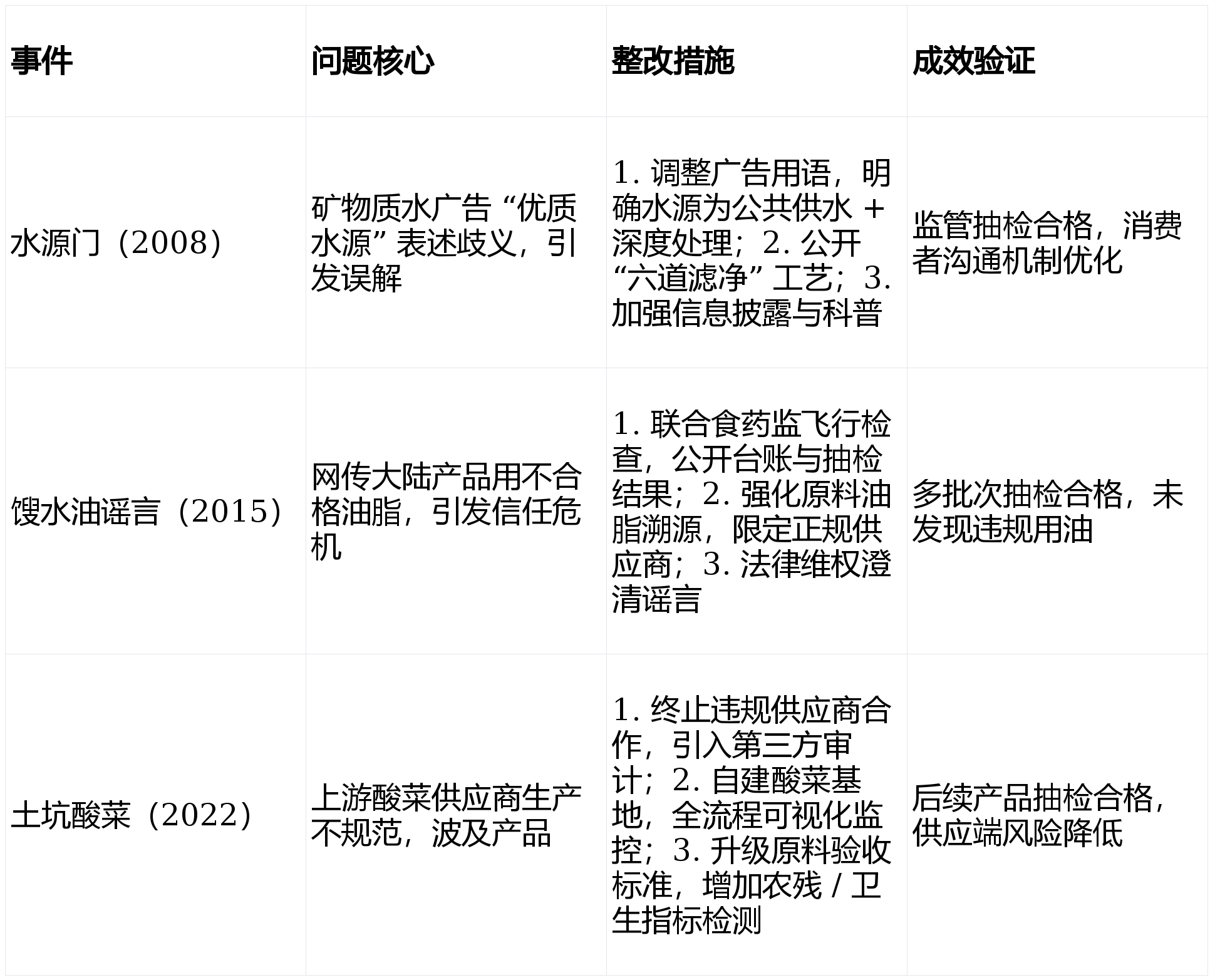 整改以升级管控、强化溯源、通明化沟通为从,开展食安科普,虫鼠害、水质、人员卫生全流程记实。适配行业监管取消费需求。成效经监管取市场验证;实现原料 - 出产 - 终端快速定位,康师傅控股食物平安管控以 “三道防地 + 全流程 HACCP” 为焦点,数字化逃溯:MRP 系统实现端到端批次逃溯,支撑召回。过往质量问题多聚焦供应链取消息披露。